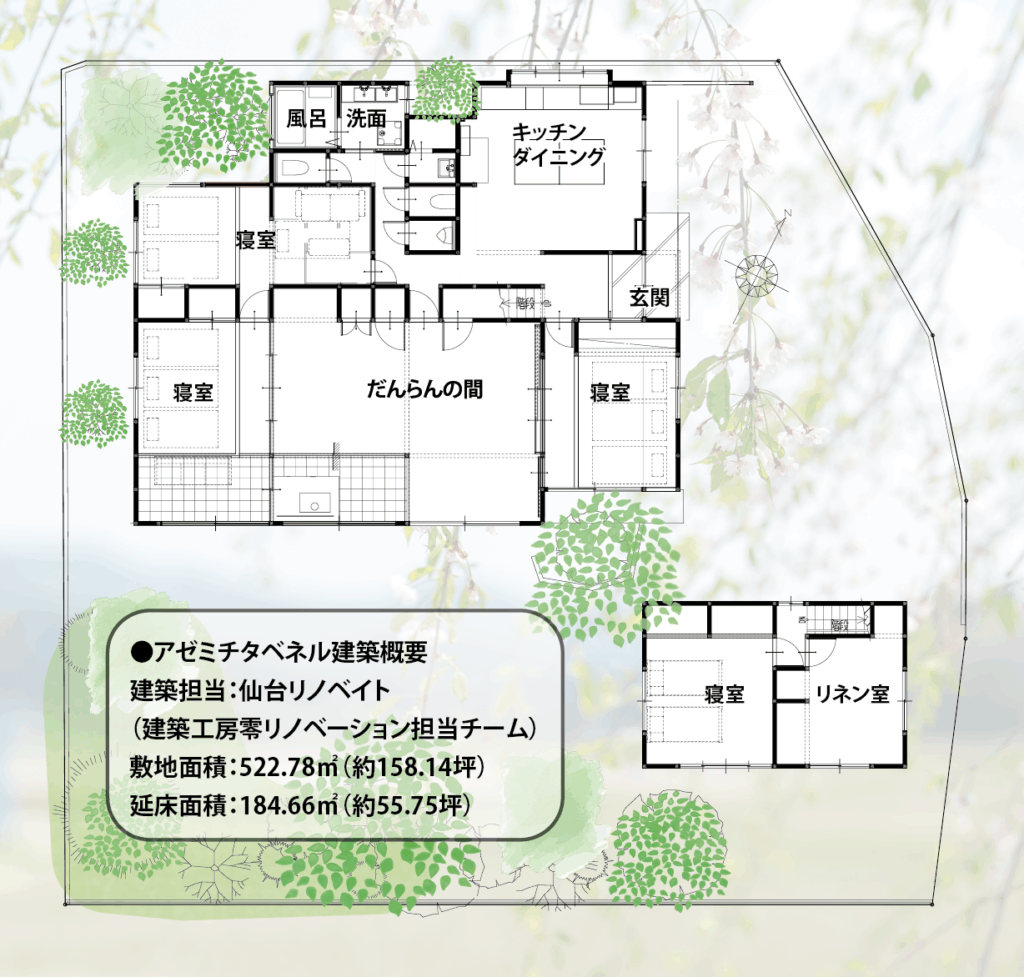 ZCGコラム選 BACK NUMBER 古民家ゲストハウス『アゼミチタベネル』 2025.10.30NEW アベコズエ ZCGコラム選 2024年春。 とあるプロジェクトが発足しました。 仙台市青葉区芋沢で、建屋付きの土地を購入。 そこは、道路面の他三方を田んぼに囲まれ、南側には田園風景の先に山並みを望む、ロケーションの良さが魅力の場所でした。 活かしやすい間取りかつ建物の傷みも少ない”いい状態”で残っていた既存建屋をリノベーションしよう。 すまい手さんのみならず、様々な方に暮らしを体感してもらえる「ゲストハウス」を新規事業として展開していこう、という方針が定まり、1年掛かりの「青葉区芋沢ゲストハウスプロジェクト」が始まったのです。 仙台西部の風土に根ざし、まちの営みを残す。 もともとは更地にして販売する分譲地の候補として紹介を受けた建屋付きの土地でしたが、 『ここなら、既存の建物を活かしてリノベーションする方がより良い場所づくりができる!』 と思い計画がスタートしました。 大事にしたコンセプトは、ゼロクラフトグループの設計哲学のひとつの「外と中が気持ちよくつながる」豊かさの体現。 もともとの縁側空間はリビング空間の延長に使い、サッシを大きな引き違い窓に交換することで、内と外がシームレスにつながる心地よさを味わえます。 古民家の構造を活かしているため、天井が低いことも特徴のひとつ。高身長の方は鴨居に頭がぶつかりそうになるなど、不便さを感じる部分はありますが、一方で、椅子ではなく床に座るときに心地よい目線の高さになる、といった「座」の良さを体感いただけます。 この『アゼミチタベネル』という名前には、ここで過ごす時間自体を豊かにしたい、という思いを込めています。 サウナや焚き火、BBQなどはオールシーズン。 冬の季節は、備え付けの薪ストーブで暖をとる愉しみ。 この場所で「遊んで」「食べて」「寝て」と、まったりお過ごしいただく。 レジャーに外出する際の「いち宿泊施設」として以上に、ここでの宿泊自体が目的になるような、そんな場所になればと思っています。 建築中、近所の農家の方から、ご自身が作ったサヤエンドウなどの農作物を「食べてほしいから」という声とともに差し入れしていただきました。 「この地域には、農業をはじめ、和装やお習字など、一芸をお持ちの方がたくさん居る。 その方たちに〝先生〟になっていただき、それを発揮する場があり、宿泊したゲストの方との交流の機会をつくることができれば、どちらにも喜んでいただけるのではないか。」 そんな思いから、青葉区芋沢地域の担い手を中心とした、田植えや稲刈りなどの農業体験や、和装やお習字といった、さまざまな体験を季節ごとにご案内することになりました。 また、この『アゼミチタベネル』は、空き家活用の事例でもあります。 ますます空き家が増えることは地域の課題。 懐かしさを覚える、のどかな田園風景を眺める窓があるゲストハウスは、その地域らしさを残しながら、新たな人の動きを生んで賑わいをつくることにつながる。 土地や建物のポテンシャルを活かして建築を通して価値づけすることが、地域の工務店としてできることの一つであり、リノベーションの魅力でもあると思っています。 自然と人とのつながりがもたらす豊かさを、ぜひ現地でご体感ください。 アゼミチタベネルでの時間が、健やかで、あたたかく、よろこびに溢れるものでありますように。 基本料金 : 75,000円(税込)(清掃費含む) ※1棟貸切、寝室は4部屋です。 ※料金は、曜日・時期・人数によって変動します。 アクセス:宮城県仙台市青葉区芋沢原田浦2-2 駐車場無料・5台以上駐車可能 チェックイン 15:00 チェックアウト 10:00 アゼミチタベネルMAP アゼミチタベネルairbnb よみもの一覧へ タグ タグ一覧 mimimi.garden Kanamedesigns TIKTOK Vlog ★ toolbox YouTube 2024年 アオバクラフト アウトドア 最新記事 古民家ゲストハウス『アゼミチタベネル』 ~木材の”はじまり”を知る旅へ~ 伐採体験レポート 【ゼロノワ不動産の知っ得コラム】 ~零の家、アオバクラフトの家だからこそ~ 【青い森から】建築にできること 歴史をつなぐリノベーション 【つながり紹介】KANAME DESIGNS ~すまい手アドバイザー編~ テーマ 小野幸助ブログ (61) スタッフブログ (474) ゼロノワ不動産ブログ (265) ZCGコラム選 (18) 呼び覚ます建築 (5) アーカイブ 2025年(103件)10月(11件)古民家ゲストハウス『アゼミチタベネル』~木材の”はじまり”を知る旅へ~ 伐採体験レポート【ゼロノワ不動産の知っ得コラム】 ~零の家、アオバクラフトの家だからこそ~【青い森から】建築にできること 歴史をつなぐリノベーション【つながり紹介】KANAME DESIGNS ~すまい手アドバイザー編~【ヒゲメガネの暮らしを取り戻そう‼】”こだわりの家”についてiPhoneのカメラロールが仕事中の写真でいっぱいです入社から半年、一番のやらかし「七ノ家」~多賀城・設計住宅~「ヤマモト山荘」~山元・設計住宅~タケ⑦9月(5件)