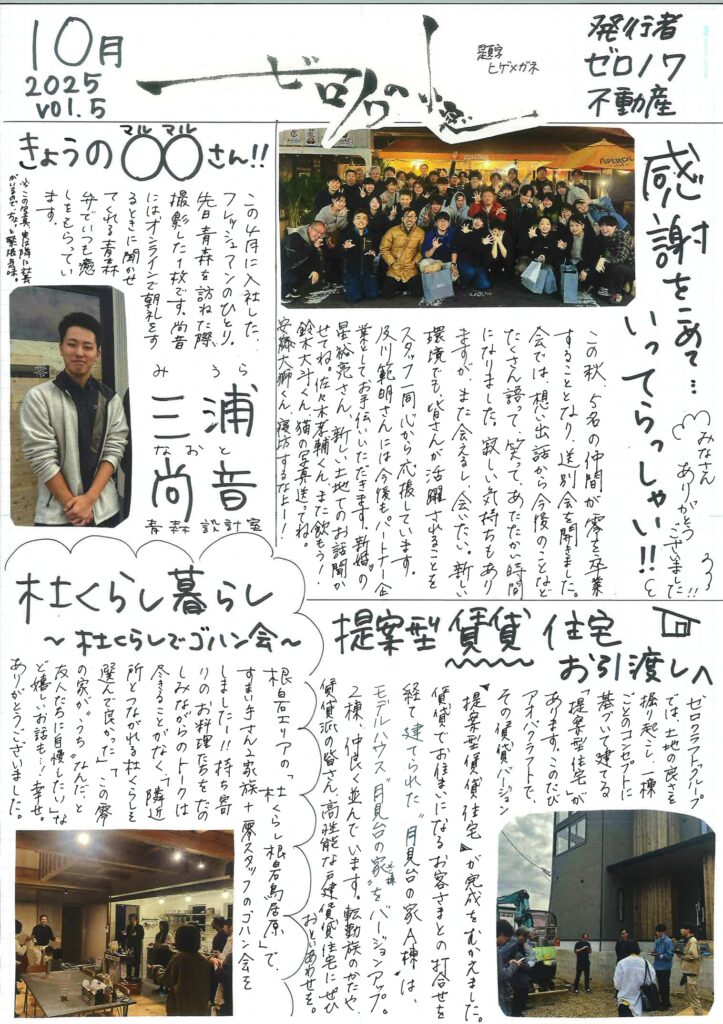【ゼロノワ不動産の知っ得コラム】 ~零の家、アオバクラフトの家だからこそ~ 2025.10.30 NEW ゼロノワ不動産は今春、新たな仲間・阿部和貴(あべかずき)を迎えました。 つい数か月前は高校三年生。今は不動産調査を勉強中です。 ということで 4 名になりました。ゼロノワ不動産史上、最多 タカヤマユカ - ZCGコラム選