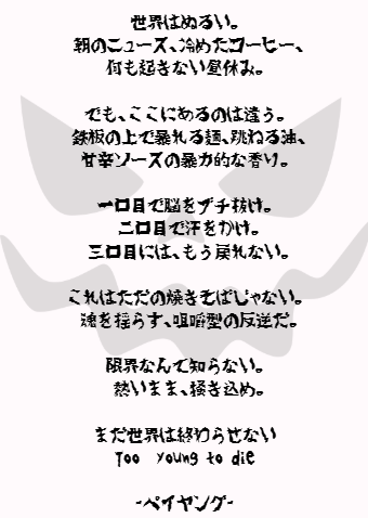 スタッフブログ STAFF BLOG 「炎の男 ペイ」 2025.11.02NEW コダマゲンキ スタッフブログ こんにちは。 零の児玉です。 11月に入り今年も残り二ヶ月となりました。 話のネタといえばやはり健康の話でしょうか。 私はビールが好きで、よくビールを飲みに行きますが、 血圧や γ – GTPの数値は気になります。 この本を私のバイブルにしたいと思います。 そういえばこのあいだ、 アドバイザー課の坂上さんから沖縄土産でハブ酒をもらいました。 (画質いいでしょ。iPhone17 proにしたんです。) ということで今回は、そんな坂上さんの紹介をしたいと思います。 零のアドバイザー課には坂上さんがいます。 坂上さんは私の所属するアドバイザー課の長でございますが、別の顔もありまして。 ⇧こんな感じでねじり鉢巻きを頭に巻いて、イベントでホットドッグ作ったり。 ⇧こんな感じでねじり鉢巻きを頭に巻いて、焼きそばを作ったりすることもあります。 焼きそばの画像は今年の8月のマルシェのものですが、 店名はコチラ→ 「ペイヤング坂上」 ギリです。笑 ちなみに1つ前の写真を拡大すると、左の真ん中にメニューがありますが、 選べるサイズは、 「小盛り」「中盛り」「ペイMAX」と非常にギリギリです。 店名の「ペイヤング」は坂上さんのお名前であるキョウヘイの「ヘイ」に由来しております。 「ペイヤング坂上」のコピーは『Too young to die.』です。 ちなみに何のイベントもない日にも、たまにねじり鉢巻きを頭に巻いてることがあります。 どのタイミングでねじり鉢巻きを巻いているのかが気になって、一度観察してみたことがありますが、 気づいたときにはもうねじって巻いておりました。 そんなこんなで今回のブログは坂上さんのご紹介でした。 Too young too die . (咀嚼型の反逆) コダマ よみもの一覧へ タグ タグ一覧 mimimi.garden Kanamedesigns TIKTOK Vlog ★ toolbox YouTube 2024年 アオバクラフト アウトドア 最新記事 「炎の男 ペイ」 〖ゼロノワの小窓〗2025.10月号 古民家ゲストハウス『アゼミチタベネル』 ~木材の”はじまり”を知る旅へ~ 伐採体験レポート 【ゼロノワ不動産の知っ得コラム】 ~零の家、アオバクラフトの家だからこそ~ テーマ 小野幸助ブログ (61) スタッフブログ (475) ゼロノワ不動産ブログ (266) ZCGコラム選 (18) 呼び覚ます建築 (5) アーカイブ 2025年(105件)11月(1件)「炎の男 ペイ」10月(12件)〖ゼロノワの小窓〗2025.10月号古民家ゲストハウス『アゼミチタベネル』~木材の”はじまり”を知る旅へ~ 伐採体験レポート【ゼロノワ不動産の知っ得コラム】 ~零の家、アオバクラフトの家だからこそ~【青い森から】建築にできること 歴史をつなぐリノベーション【つながり紹介】KANAME DESIGNS ~すまい手アドバイザー編~【ヒゲメガネの暮らしを取り戻そう‼】”こだわりの家”についてiPhoneのカメラロールが仕事中の写真でいっぱいです入社から半年、一番のやらかし「七ノ家」~多賀城・設計住宅~「ヤマモト山荘」~山元・設計住宅~タケ⑦9月(5件)〖ゼロノワの小窓〗2025.9月号零の提案型住宅見分けられますか最新のぜろクラフト通信と最近のお昼ごはん秋保で新生活を始めませんか?8月(14件)実は…〖ゼロノワの小窓〗2025.8月号今後の目標γ-GTPだのChatGPTだのすまい手さんと食育イベント。収穫が待ち遠しいお盆中のお話しひと時のお盆休みタケ⑥~私のお盆休み!!!!~青森設計室もスタッフ募集してます!!ヒラヤマさんにつづいて私たちと働いてみませんか? インターンシップのすゝめ青森で1番くらいに人が多い時期ぜろマルシェ初開催!の様子と、この夏のおススメドリンクタケ⑤~見学会編~「パノラマハウス」~多賀城・設計住宅~7月(15件)〖ゼロノワの小窓〗2025.7月号ワクワクする場所のハナシ模型についてパノラマとペプチドタケ④(阿部ちゃんに被せて草刈りについて)山元町といったら?誰でも農地が購入できるんです今年も目指します知事賞を最近蒸し暑いですね蔵の改修工事を終え、お引き渡し。「予防空き家」を流行らせたいと強く思った朝。タケ③今年も草の季節が伐採体験ツアーに行ってきましたはじめまして6月(17件)この時期がやってきました!〖ゼロノワの小窓〗創刊!!市制施行してもうすぐ100年になるそうです山元町のホームページを見ていたら坂を下った先にある、空。公共交通機関で空見のいえに行ってみたほぼ夏な青森のこの頃タイトルを「タケ」にしていきます。こんにちは、はじめまして!4人目らしいですよ新しい趣味始めました。SAUNA本日6/10、18:15あたりからのどこかで企画広報チーム、外にどんどこ進出中。ヘビが苦手な方、写真ご注意ください。初めまして。始めました。「A-wood」青森県産木材を積極的に!5月(14件)写真の撮り方にもいろいろありますなんとかしたい、空き家や相続お引き渡し 蒼の家キラキラな新人さんたち小野寺日記_16小野 航河ですアド課新人、初のブログです。GW明けの1週間ちょっとすまい手さんへ「暮らしのインタビュー№2」考えすぎない方が良いことタキビトってどんな部署?タキビ