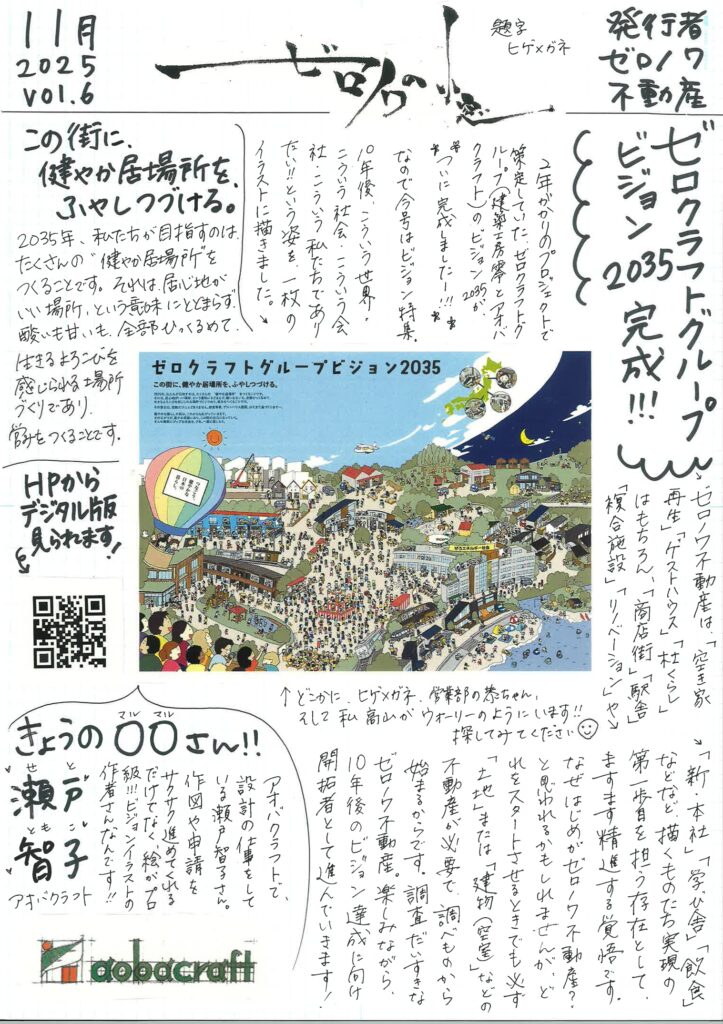 ゼロノワ不動産ブログ ZERONOWA BLOG 〖ゼロノワの小窓〗2025.11月号 2025.11.29NEW タカヤマユカ ゼロノワ不動産ブログ こんにちは。高山です。 ゼロノワの小窓、11月号は、先日完成・お披露目されたばかりの 【ゼロクラフトグループ ビジョン2035】の特集号です! ぜひ、ご覧ください。 よみもの一覧へ タグ タグ一覧 365ぜろクラフト通信 mimimi.garden Kanamedesigns TIKTOK Vlog ★ toolbox YouTube 2024年 アウトドア 最新記事 新生活、始めませんか? 〖ゼロノワの小窓〗2025.11月号 最近の出来事と趣味の話! 『基準』ってありますか? 囲の家|暮らしの足あと テーマ 小野幸助ブログ (61) スタッフブログ (480) ゼロノワ不動産ブログ (269) ZCGコラム選 (21) 呼び覚ます建築 (5) アーカイブ 2025年(119件)11月(15件)新生活、始めませんか?〖ゼロノワの小窓〗2025.11月号最近の出来事と趣味の話!『基準』ってありますか?囲の家|暮らしの足あと私の本棚とお気に入り②私の本棚とお気に入り①TALK SESSION -楓の下に集い まちに開く-タケ⑧~お休みの1日~〖ZCGげんば探訪記〗創刊!!私のお話相手になってくれますか母校訪問してきました最近の零のこと小野寺日記_17「炎の男 ペイ」10月(12件)〖ゼロノワの小窓〗2025.10月号古民家ゲストハウス『アゼミチタベネル』~木材の”はじまり”を知る旅へ~ 伐採体験レポート【ゼロノワ不動産の知っ得コラム】 ~零の家、アオバクラフトの家だからこそ~【青い森から】建築にできること 歴史をつなぐリノベーション【つながり紹介】KANAME DESIGNS ~すまい手アドバイザー編~【ヒゲメガネの暮らしを取り戻そう‼】”こだわりの家”についてiPhoneのカメラロールが仕事中の写真でいっぱいです入社から半年、一番のやらかし七ノ家|暮らしの足あとヤマモト山荘|暮らしの足あとタケ⑦9月(5件)〖ゼロノワの小窓〗2025.9月号零の提案型住宅見分けられますか最新のぜろクラフト通信と最近のお昼ごはん秋保で新生活を始めませんか?8月(14件)実は…〖ゼロノワの小窓〗2025.8月号今後の目標γ-GTPだのChatGPTだのすまい手さんと食育イベント。収穫が待ち遠しいお盆中のお話しひと時のお盆休みタケ⑥~私のお盆休み!!!!~青森設計室もスタッフ募集してます!!ヒラヤマさんにつづいて私たちと働いてみませんか? インターンシップのすゝめ青森で1番くらいに人が多い時期ぜろマルシェ初開催!の様子と、この夏のおススメドリンクタケ⑤~見学会編~パノラマハウス|暮らしの足あと7月(15件)〖ゼロノワの小窓〗2025.7月号ワクワクする場所のハナシ模型についてパノラマとペプチドタケ④(阿部ちゃんに被せて草刈りについて)山元町といったら?誰でも農地が購入できるんです今年も目指します知事賞を最近蒸し暑いですね蔵の改修工事を終え、お引き渡し。「予防空き家」を流行らせたいと強く思った朝。タケ③今年も草の季節が伐採体験ツアーに行ってきましたはじめまして6月(17件)この時期がやってきました!〖ゼロノワの小窓〗創刊!!市制施行してもうすぐ100年になるそうです山元町のホームページを見ていたら坂を下った先にある、空。公共交通機関で空見のいえに行ってみたほぼ夏な青森のこの頃タイトルを「タケ」にしていきます。こんにちは、はじめまして!4人目らしいですよ新しい趣味始めました。SAUNA本日6/10、18:15あたりからのどこかで企画広報チーム、外にどんどこ進出中。ヘビが苦手な方、写真ご注意ください。初めまして。始めました。「A-wood」青森県産木材を積極的に!5月(14件)写真の撮り方にもいろいろありますなんとかしたい、空き家や相続お引き渡し 蒼の家キラキラな新人さんたち小野寺日記_16小野 航河ですアド課新人、初のブログです。GW明けの1週間ちょっとすまい手さんへ「暮らしのインタビュー№2」考えすぎない方が良いことタキビトってどんな部署?タキビトのGW炊いて、食べる。NIWA-TORI4月(11件)新入生歓迎会開催🌸すまい手さん一年点検に同行させていただきました電気配線始まりました!寄せて、ずらす。田んぼに囲まれた古民家のリノベ素地家のこと暗がりは好きだけどこの闇はいやだ。自分と同い年の道具?空見の家のススメ5人に1人が当てはまる!?知らないと損する家族信託とは?【YouTubeをブログにしちゃいました①】感性検査3月(7件)皆さん、いよいよゲストハウスがOPENです。4/26(土)ですよー新生活 シーズン4大盛況だった「ママさん座談会」【Kanamedesignsさん】ラジオご出演のおはなし その2本当に素材が違うだけ…?【Kanamedesignsさん】ラジオご出演のおはなし その1とある日の記憶。2月(3件)「居心地」提案型賃貸住宅のススメそれぞれのバレンタイン納得の新事実が発覚いたしました。1月(6件)零の改修人「仙台リノベイト」誕生1月も師走くらいのスピードで過ぎていて驚愕。自分好みにしちゃうすまい手さんへ「暮らしのインタビュー №1」365号外&ウラロジ企画のウラ話小野寺日記_152024年(73件)12月(4件)年末年始は○○の話を…。年末に伝えたいことはやっぱり。グリーンの癒しブログも読んでほしいし、見学会にも来てほしい。11月(6