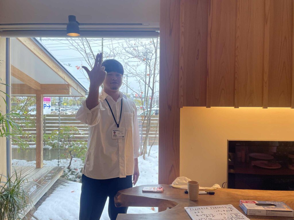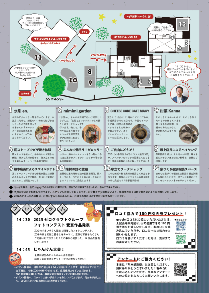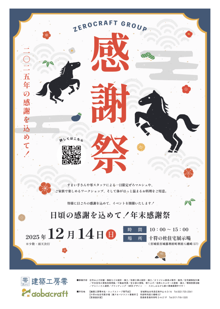 スタッフブログ STAFF BLOG 降雪、雨天、からの晴天!🌞年末感謝祭2025レポ 2025.12.18NEW ニイヤマサナ スタッフブログ こんにちはー! 企画広報の新山です。 今回は、先日開催した年末感謝祭のイベントについてお届けします🌸 ボリューム超マシマシになっていますが、ぜひ最後まで読んでいただけたら嬉しいです☺︎ ドン!! ということで、開催しました、年末感謝祭。 十符の杜住宅展示場にて、12/14(日)に開催しました。 今回は、ある懸念点が。 そうです。 雪マーク、ついてましたよね・・・・⛄ いやいや、幼いころから晴女と呼ばれた私です。雪予報といっても、すぐ止むでしょ~!なんて思ってました。 今シーズン初ってくらい、降りましたね。 びっくりです。 スタッフみんなで、一部すまい手さんにも手伝っていただきながら(本当にありがとうございました!!)せっせと雪かき・・・!! 何とかみんなで会場を整えて、準備を終えました。 そして10時、いよいよイベント開始。 雨が降り足元が悪くなっている中でしたが、たくさんのすまい手さんやつながりのある方が来てくださいました! ウェルカムドリンク担当、ゼロノワ不動産より左から阿部・阿部です。どっちも阿部です。 左が阿部かずきくん、右が阿部はるかさんです。 企画広報の桃子さんから伝説のレシピを受け継ぎ、特製ホットワインを作ってくれました!🍷 阿部かずくんがラーメン屋のようにずっと鍋の中を混ぜていたのが印象的でしたね。 スマイルポテト担当、左からアオバクラフトの泉さん、ゼロノワ不動産の棚木さんです!🍟 2人はあるチェーン店で修業を積んだ、その道を極めた戦士たちです。 雨にも風邪にも油のハネにも負けず・・・!熱々のポテトを提供していました! みんな大好きペイヤング!! この写真からもわかるとおり、量が半端ないですね。 ランチパックが閉まらないほどの焼きそばのボリュームに、持ち帰りの袋を希望する方が続出でした。 ちなみに、焼きそばコーナーに貼っていたポップやメニュー表、実は坂上部長の手作りです。広報として負けられないなと、影でアセアセしました。 零オリジナルの傘立てワークショップ。 今回は総務経理の千葉さんと、設計課の山口くんが担当。そして守人の樋口さんが監修です。 今回は、零の家を建築する際に出る床材の余りを使用して作りました! 皆さん、ぜひ玄関でご活用くださいねー!🌂🌟 大人気だった薪ストーブでのピザ焼きワークショップ。 好きな具材を載せて、オリジナルピザをつくりました🍕🔥 店長を務めたのは、美味しいお酒が大好き・アドバイザーの児玉さんと、「自分には小学校の時に作ったドラゴンのエプロンしかない」と話していた、設計課の小野くん。 ちなみに小野くんは普段料理はしないそうですが、薪ストーブでピザが焼けるようになりました。おしゃれ男子爆誕です。 零のすまい手さんによるすまい手の会。 今回は、零オリジナルツリーを使って、お子さんを中心にみんなで飾り付け! できたツリーは、クリスマス期間中、十符の杜住宅展示場にて展示します🎄 そして今回はすまい手さん、スタッフ家族によるプチマルシェも! 零のすまい手さん、ご家族はすっごく素敵な趣味やお店を出店しているんです。 私も何点か購入させていただきました~! インスタのリンクも貼りますので、ぜひご覧くださいね☺︎ mimimi.gardenさんによるしめ縄ワークショップ! ご自宅のお庭のグリーンなどを活かして、素敵なしめ縄を作ります。 しかも零のカンナリボンを使ったアレンジまで!素敵でした~💓 mimimi.garden instagram 初出店!水引 en.さんによる水引ワークショップ。 小さなお子さんから大人の方まで、夢中になってました。 ちなみに、今年のゼロクラフトグループのフォトコンテスト参加賞品である水引ブックマーカーの制作をしていただきましたー!🌟 水引 en. instagram 富谷でお店を営んでいるchese cake cafe MAGYさん。 実は守人の樋口さんのご家族のお店!☕ おふたりともそっくり・・・素敵な笑顔です☺︎ たくさんの方がMAGYさんのブースでコーヒーを片手にくつろいでいました💭 気になる方は、ぜひお店へ! chese cake cafe MAGY instagram カンナさんによる編み物ショップ。 実はヒゲメガネこと小野社長の娘さん! 小さなお子さんから大人の方まで、素敵なものが多すぎて、どれにしようか悩んでました。 ちなみに私はバッグを購入させていただきました!なんと同期2人と色違い。全然違うタイミングで購入したのに、すごい。 柑菜Kanna insuatgram お昼に差し掛かったころには、朝の天気が嘘のように晴れてました!🌞 最後には、今年開催したフォトコンテストの結果発表と、じゃんけん大会を開催。 ちなみに、フォトコンテストで受賞した作品はゼロクラフトグループの2026年カレンダーに採用させていただきましたー!ぜひ皆様お楽しみに! じゃんかん大会で見事商品を勝ち取った皆様、ぜひ賞品をご活用いただけますと幸いです! ブログがすごく長くなりそうなので、ここからは、
