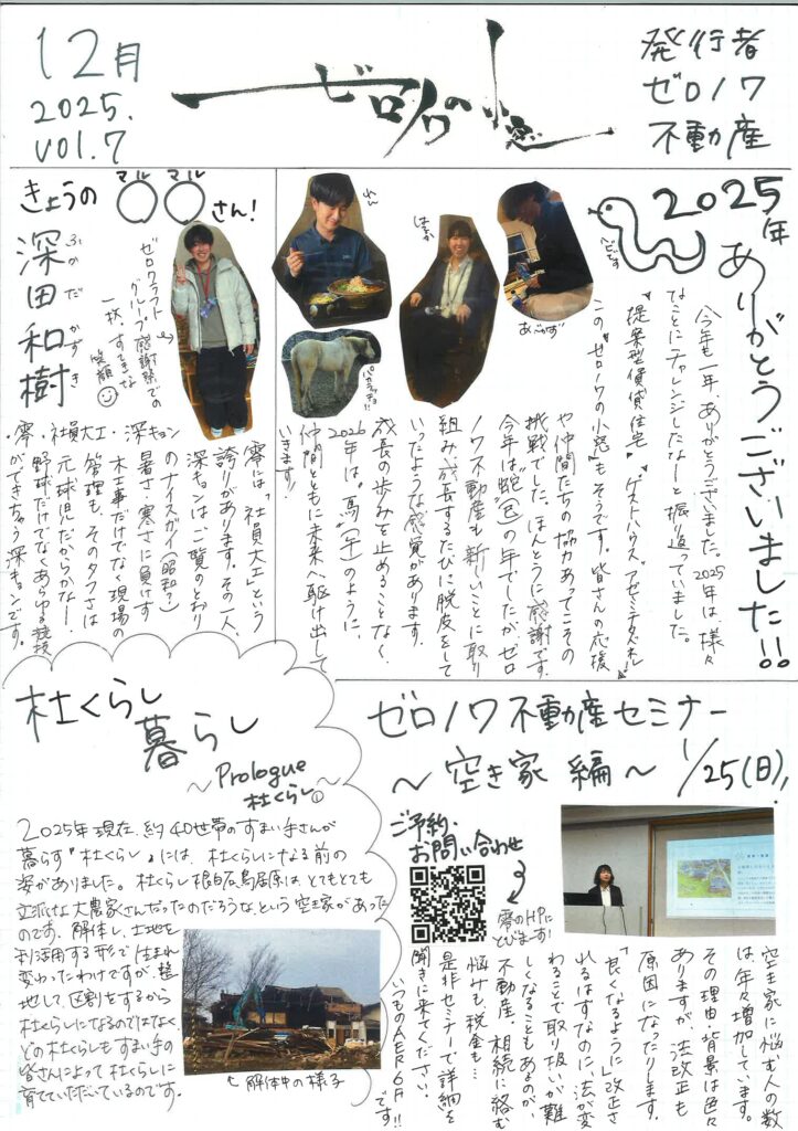 ゼロノワ不動産ブログ ZERONOWA BLOG 〖ゼロノワの小窓〗2025.12月号 2025.12.26NEW タカヤマユカ ゼロノワ不動産ブログ こんにちは。今年ももう間もなく終わりなんてびっくりです。 ゼロクラフトグループ2社(建築工房零・アオバクラフト)も今日が仕事納めの日。 2025年も大変お世話になりありがとうございました。 12月号のゼロノワの小窓を是非ご覧ください。 また2026年お会いしましょう! ※私は滅多に絵を描きませんから、ちょっとレアです。🐍 よみもの一覧へ タグ タグ一覧 365ぜろクラフト通信 mimimi.garden Kanamedesigns TIKTOK Vlog ★ toolbox YouTube 2024年 アウトドア 最新記事 くま 〖ゼロノワの小窓〗2025.12月号 タケ⑨ 1年間を振り返っていく! 即日設計大会 vol.11 降雪、雨天、からの晴天!🌞年末感謝祭2025レポ テーマ 小野幸助ブログ (62) スタッフブログ (483) ゼロノワ不動産ブログ (271) ZCGコラム選 (23) 呼び覚ます建築 (5) アーカイブ 2025年(127件)12月(8件)くま〖ゼロノワの小窓〗2025.12月号タケ⑨ 1年間を振り返っていく!即日設計大会 vol.11降雪、雨天、からの晴天!🌞年末感謝祭2025レポ【青い森から】 (青森で働きたい) 浅虫の海風のような若者【つながり紹介】mimimi.garden ~すまい手アドバイザー編~【ヒゲメガネの暮らしを取り戻そう‼】今回は、家づくりの発信について11月(15件)新生活、始めませんか?〖ゼロノワの小窓〗2025.11月号最近の出来事と趣味の話!『基準』ってありますか?囲の家|暮らしの足あと私の本棚とお気に入り②私の本棚とお気に入り①TALK SESSION -楓の下に集い まちに開く-タケ⑧~お休みの1日~〖ZCGげんば探訪記〗創刊!!私のお話相手になってくれますか母校訪問してきました最近の零のこと小野寺日記_17「炎の男 ペイ」10月(12件)〖ゼロノワの小窓〗2025.10月号古民家ゲストハウス『アゼミチタベネル』~木材の”はじまり”を知る旅へ~ 伐採体験レポート【ゼロノワ不動産の知っ得コラム】 ~零の家、アオバクラフトの家だからこそ~【青い森から】建築にできること 歴史をつなぐリノベーション【つながり紹介】KANAME DESIGNS ~すまい手アドバイザー編~【ヒゲメガネの暮らしを取り戻そう‼】”こだわりの家”についてiPhoneのカメラロールが仕事中の写真でいっぱいです入社から半年、一番のやらかし七ノ家|暮らしの足あとヤマモト山荘|暮らしの足あとタケ⑦9月(5件)〖ゼロノワの小窓〗2025.9月号零の提案型住宅見分けられますか最新のぜろクラフト通信と最近のお昼ごはん秋保で新生活を始めませんか?8月(14件)実は…〖ゼロノワの小窓〗2025.8月号今後の目標γ-GTPだのChatGPTだのすまい手さんと食育イベント。収穫が待ち遠しいお盆中のお話しひと時のお盆休みタケ⑥~私のお盆休み!!!!~青森設計室もスタッフ募集してます!!ヒラヤマさんにつづいて私たちと働いてみませんか? インターンシップのすゝめ青森で1番くらいに人が多い時期ぜろマルシェ初開催!の様子と、この夏のおススメドリンクタケ⑤~見学会編~パノラマハウス|暮らしの足あと7月(15件)〖ゼロノワの小窓〗2025.7月号ワクワクする場所のハナシ模型についてパノラマとペプチドタケ④(阿部ちゃんに被せて草刈りについて)山元町といったら?誰でも農地が購入できるんです今年も目指します知事賞を最近蒸し暑いですね蔵の改修工事を終え、お引き渡し。「予防空き家」を流行らせたいと強く思った朝。タケ③今年も草の季節が伐採体験ツアーに行ってきましたはじめまして6月(17件)この時期がやってきました!〖ゼロノワの小窓〗創刊!!市制施行してもうすぐ100年になるそうです山元町のホームページを見ていたら坂を下った先にある、空。公共交通機関で空見のいえに行ってみたほぼ夏な青森のこの頃タイトルを「タケ」にしていきます。こんにちは、はじめまして!4人目らしいですよ新しい趣味始めました。SAUNA本日6/10、18:15あたりからのどこかで企画広報チーム、外にどんどこ進出中。ヘビが苦手な方、写真ご注意ください。初めまして。始めました。「A-wood」青森県産木材を積極的に!5月(14件)写真の撮り方にもいろいろありますなんとかしたい、空き家や相続お引き渡し 蒼の家キラキラな新人さんたち小野寺日記_16小野 航河ですアド課新人、初のブログです。GW明けの1週間ちょっとすまい手さんへ「暮らしのインタビュー№2」考えすぎない方が良いことタキビトってどんな部署?タキビトのGW炊いて、食べる。NIWA-TORI4月(11件)新入生歓迎会開催🌸すまい手さん一年点検に同行させていただきました電気配線始まりました!寄せて、ずらす。田んぼに囲まれた古民家のリノベ素地家のこと暗がりは好きだけどこの闇はいやだ。自分と同い年の道具?空見の家のススメ5人に1人が当てはまる!?知らないと損する家族信託とは?【YouTubeをブログにしちゃいました①】感性検査3月(7件)皆さん、いよいよゲストハウスがOPENです。4/26(土)ですよー新生活 シーズン4大盛況だった「ママさん座談会」【Kanamedesignsさん】ラジオご出演のおはなし その2本当に素材が違うだけ…?【Kanamedesignsさん】ラジオご