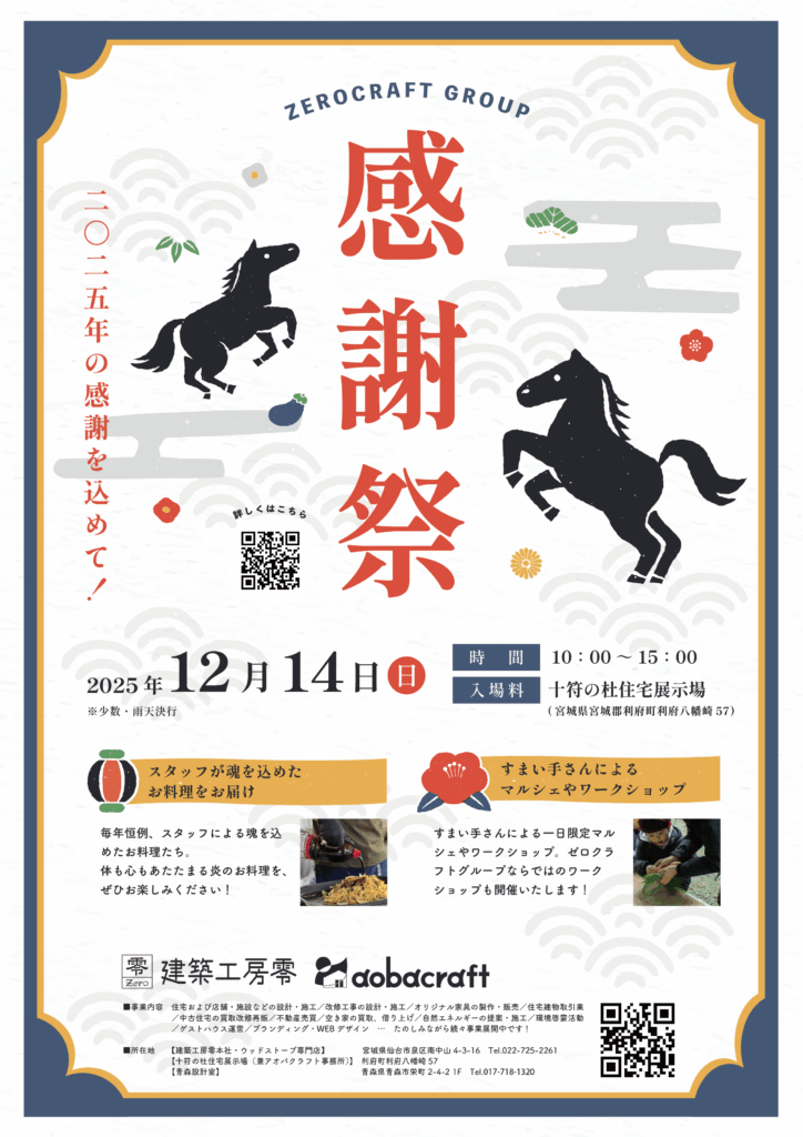 日頃の感謝を込めて!年末感謝祭2025 12.14(sun) イベント 受付中 #ぜろマルシェ #ピックアップ #感謝祭 いますぐ予約する 12.14(sun) 1時間 / 回 10:00 - このイベントを予約する 今年も年末感謝祭開催決定! 皆様に日ごろの感謝を込めて、今年最後のイベントを開催いたします! すまい手さんや零スタッフによる一日限定ぜろマルシェや、体がほっと温まるお料理をご用意しております! 詳細は随時更新予定!引き続き情報をお楽しみに🌟 傘立てづくりワークショップ!《事前予約制・増枠しました!》 家で使われているのと同じ、スギの無垢木材を使った傘立てを作ります! 今回は、床材を使用して傘立てを作ります。最後にはオリジナルの焼き印をつけて完成です♪玄関に、新たな彩りを加えてみませんか? ■開催時間: ①10時~<残り1枠! ②11時~<残り1枠! ③13時~<満員御礼! ※各枠1時間程度 ■事前予約:必須 ■料 金:800円 ※お支払いはpaypayのみとなります。現金でのお支払いは原則不可となりますので、予めご了承ください。 ■参加人数:1枠2組まで ※傘立てづくりは各ご家庭お一つ限定になります。 ■推奨年齢:全年齢 ※ご年齢に合わせて、必ず大人の方の付き添いをお願いいたします。 薪ストーブでピザを焼こう!ピザ焼き体験《事前予約制・満員御礼》 暖をとるだけでなく、暮らしを豊かに彩る薪ストーブの新たな魅力を発見しませんか? 当イベントでは、話題の薪ストーブを実際に使用し、本格的なピザ焼きを体験していただけます!好きな具材を載せて、焼き立てのピザを楽しみましょう!🍕 ■開催時間: ①10時~<満員御礼! ②10時40分~<満員御礼! ③11時20分~<満員御礼! ④12時~<満員御礼! ⑤12時40分~<満員御礼! ⑥13時20分~<満員御礼! ※各枠30分程度 ■事前予約:必須 ■料 金:700円 ※お支払いはpaypayのみとなります。現金でのお支払いは原則不可となりますので、予めご了承ください。 ■参加人数:1枠1組まで ※ピザは各ご家庭1枚限定になります。 ■推奨年齢:全年齢 ※ご年齢に合わせて、必ず大人の方の付き添いをお願いいたします。 \薪ストーブユーザー必見!/端材料の袋詰め放題 零の家の建築時に出る「端材」の袋詰め放題を開催! 薪ストーブユーザーはもちろん、DIYにもご活用いただけます🔥 ■開催時間: 10時~14時 ■事前予約:不要 ■料 金:500円 ※お支払いはpaypayのみとなります。現金でのお支払いは原則不可となりますので、予めご了承ください。 ※端材がなくなり次第終了となります。予めご了承ください。 ■推奨年齢:全年齢 ※ご年齢に合わせて、必ず大人の方の付き添いをお願いいたします。 すまい手さんによるマルシェ・ワークショップも開催! 【mimimi.garden】お正月に向けて♪しめ飾りワークショップ《事前予約制》 【出店者コメント】 建築工房零すまい手歴18年、「グリーンアドバイザー」のmimimi.gardenです 感謝祭恒例「生花とカンナリボンのしめ飾り」をつくってみませんか? 今年は「水引en.」さんの水引細工あわじ結びとコラボ! 松、南天などのグリーンを中心に、零の大工さんによるカンナリボンをあしらって仕上げます 他にもmimimi手作りのお正月飾りやスワッグも販売予定 ワークショップで世界で一つの一品を仕上げるも良し、販売で手軽に手にとっていただくも良し! ぜひお立ち寄りください ■開催時間: ①10時30分~<満員御礼! ②11時30分~<満員御礼! ③12時30分~<満員御礼! ④13時30分~<満員御礼! ※各枠45分程度 ■事前予約:必須 ■料 金:1,000円 ■参加人数:1枠2組まで ■推奨年齢:全年齢 ※ご年齢に合わせて、必ず大人の方の付き添いをお願いいたします。 instagramはこちら 【水引 en.】あわじ結びでポチ袋を作ろう!水引ワークショップ《事前予約制》 【出店者コメント】 初めまして。 水引en.を屋号として、水引のアクセサリー等を作っています。すまい手歴は9年となります。 この度、ご縁をいただきまして、ワークショップをさせていただくことになりました。 お正月に向けて、縁起のいいあわじ結びをあしらったポチ袋を作ってみませんか?この機会に是非、水引の世界を体験してみてください。 なお、当日はキーホルダーなどの販売も行いますので、どうぞお気軽にお立ち寄りください ■開催時間: ①10時~<満員御礼! ②11時~ ③12時~<残り1枠! ④13時~ ※各枠30分程度、2つ制作 ■事前予約:必須 ■料 金:500円 ■参加人数:1枠2組まで ■推奨年齢:全年齢 ※ご年齢に合わせて、必ず大人の方の付き添いをお願いいたします。 instagramはこちら CHEESE CAKE CAFE MAGY 【出店者コメント】 煎りたて・挽きたて・淹れたてにこだわるお店です。 看板となっている「タイムブレンド」は「0(ゼロ)」「12:30(イチニイサンゼロ)」「23:55(ニイサンゴーゴー)」などがあり、「アイスブレンド」を含む8種のオリジナルブレンドを提供しています。 今回のマルシェでは「ゼロ」ブレンドを提供します。超初心者向けのスッキリとした味わいでコーヒーが苦手な方でもブラックで飲めてしまいます。 instagramはこちら 【柑菜Kanna】 【出店者コメント】 そのときと