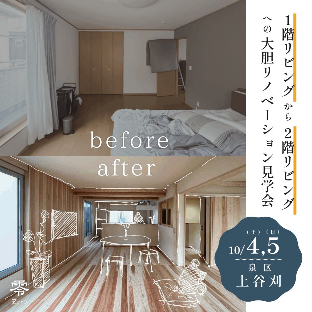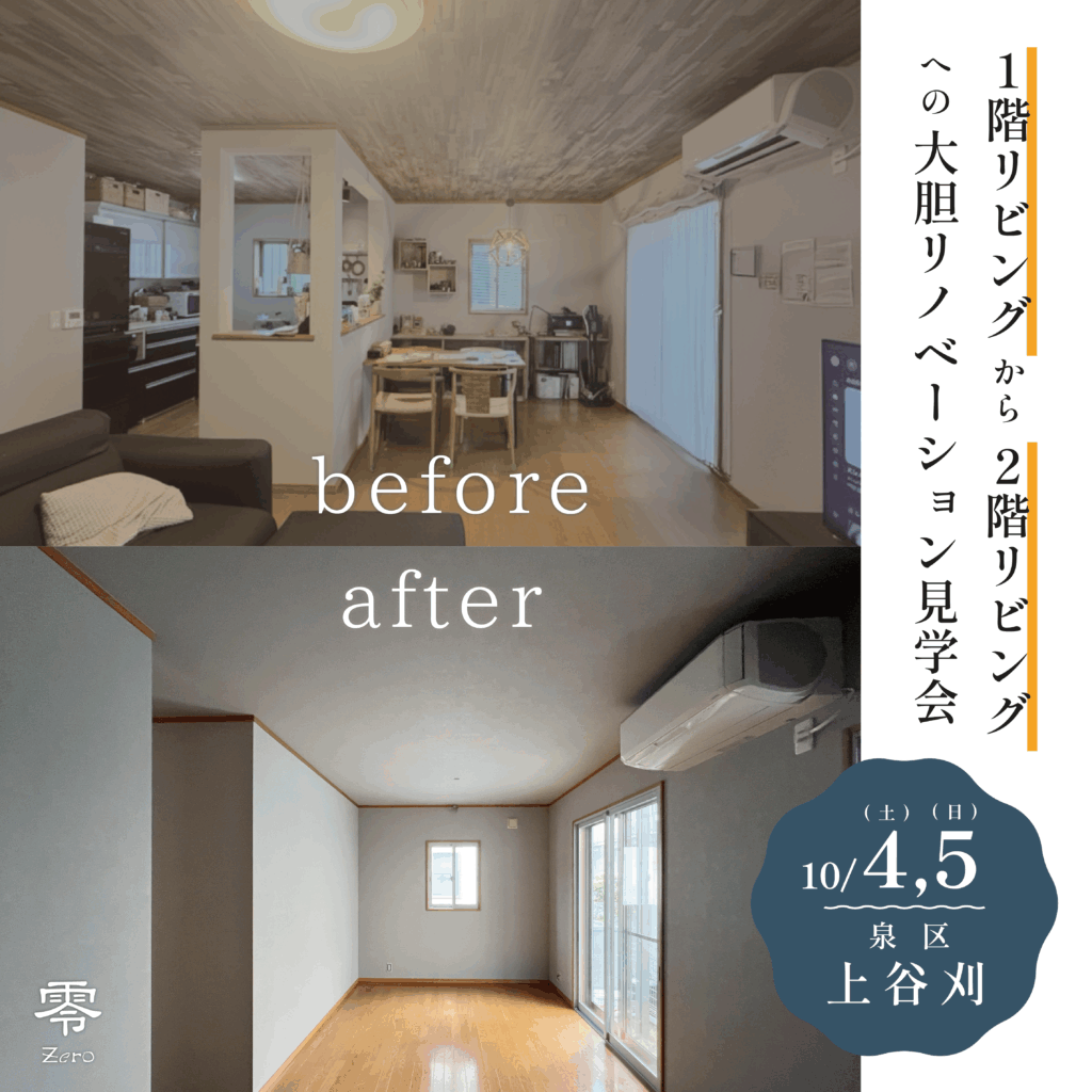 「1階リビングから2階リビングへとリノベーションした住まい」完成見学会@上谷刈 10.4(sat)-5(sun) 見学会 終了 #リノベーション住宅 #上谷刈 #完成見学会 いますぐ予約する 10.4(sat) 1時間 / 回 10.5(sun) 1時間 / 回 終了しました。 泉区上谷刈に建つリノベーション住宅 今回ご覧いただけるお住まいは、上谷刈に建つお住まい。 建築工房零の木造戸建専門のリノベーション技術集団、「仙臺リノベイト」がリノベーションしたお住まいです。 暗かった1階リビングを、太陽の光をたっぷりと取り込む2階リビングへと大胆にリノベーションいたしました。 2階寝室を2階リビングに 1階リビングを、1階寝室に リノベーション前は薄暗かった1階リビングのこちらのお住まい。 2階の無駄な間仕切りをなくし、光と風が通り抜ける開放的な空間を実現させました。 2階には広々としたアウトドアバルコニーを設けることで、リビング空間を延長させ、面積以上の広がりを感じさせます。 見どころポイント 薄暗かった1階リビングから、太陽の光を取り込む2階リビングのお住まいに 無駄な間仕切りを取っ払うことで、開放感のある空間を実現 リビング空間を延長させる、広々としたアウトドアバルコニー 仙臺リノベイトとは 現場管理担当:仙臺リノベイト ご案内スタッフ:アドバイザー(坂上恭平/児玉元起/宮崎千遥/武田莉佳) イベント詳細 開催日時 10/04(土)10:00、11:00、13:00、14:00、15:00、16:0010/05(日)10:00、11:00、13:00、14:00、15:00、16:00 住所 仙台市泉区上谷刈 備考 ・開催場所はご予約いただいた方に直接ご連絡いたします。 ・オンラインでもご案内しております。是非お気軽にご相談ください。 ・現地では手袋の着用、靴下の着用をお願いしております。 ご予約は、お電話、予約フォームで承っております。 家づくりの参考になる「リアルな情報」が満載です! 下記のお電話、予約フォームよりお気軽にお申込みください。 tel. 022-725-2261 9:00~17:00(土日祝日も受付) 定休日 : 毎週水日 その他のイベント 東北キャンピングカーフェア2025 10.11(sat)-12(sun) イベント 終了 #キャンピングトレーラー #ピックアップ #外部イベント 「七ノ家」完成見学会@多賀城市 10.18(sat)-19(sun) 見学会 受付中 #2階リビング #ピックアップ #多賀城市 #完成見学会 #設計住宅 「DIVE! 工務店学」 第1回9/6(土)講義+座談会(Zoom開催) ※第2回11/22(土)発表会 9.6(sat)-11.22(sat) イベント 受付中 #オンライン開催 #ピックアップ #工務店学 BACK ALL
