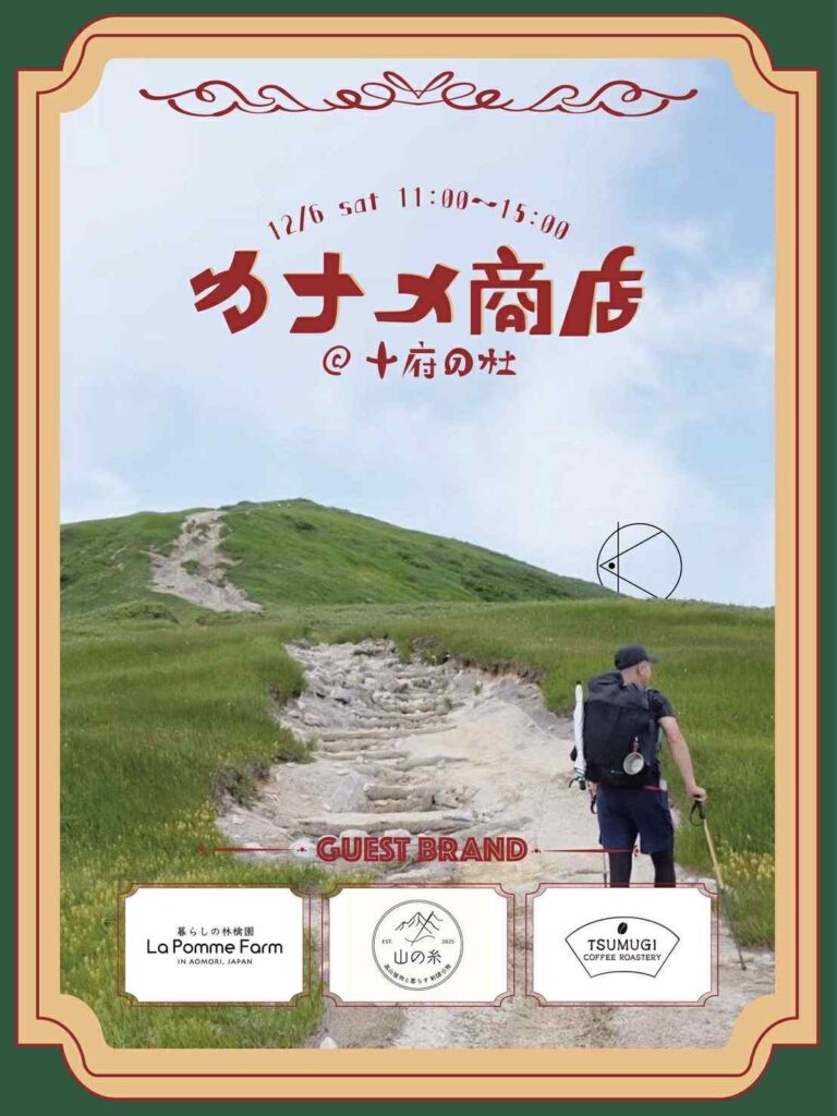 1日限定POPOP!【カナメ商店】 12.6(sat) イベント 終了 #コラボイベント 予約制 展示場見学|ご予約はこちらから この度、十符の杜住宅展示場 にて、アウトドアブランド「KANAME DESIGNS」初のイベントとなる 「カナメ商店」 を開催いたします! 2025年を締めくくるアットホームなイベントとして、KANAMEDESIGNSだけでなく、素敵なゲストブランドにもお越しいただきます。 12月と寒い時期ですが、展示場内は薪ストーブで温かくしてお待ちしております。ゆったりと、まったりと、お話ししにいらしてください。 出店者情報 KANAME DESIGNS KANAMEDESIGNSは、日々の遊びから感じる『あったら良いな』を、シンプルな形で提案していきます。 KANAMEは、扇の要を意味し、KANAMEを軸に色々なアイディアの広がりをイメージしています。 これからたくさんの方々と出会い、作り上げた物が、皆様の生活に彩りを添えられればと思います。 instagram 暮らしの林檎園 La Pomme Farm 青森県でりんご栽培をしています。 当日は生のりんごやジュースをはじめとする加工品、そして山歩きのためのりんごアイテムをお持ちします。 生のりんごの販売は今時期だけ🍎 山歩く人もそうでない人も楽しめるラインナップでお待ちしていますので、お気軽にお話しにいらしてください^^ instagram 山で出会った草花の姿をひと針ずつ刺繍し、日々の暮らしにそっと寄り添う小物を作っております。 作品を手にとってくださった方が、日常の中でもふと山を思い出したり、自然の息吹を感じていただけたら嬉しいです。 inatagram TSUMUGI COFFEE ROASTERYは、 日々のあいだにそっと現れる “コーヒーのセーブポイント” inatagram イベント詳細 開催日時 12/6(土)11:00~15:00 住所 【十符の杜住宅展示場モデルハウス】〒981-0112 利府町利府八幡崎57-1 備考 ご予約は、お電話、予約フォームで承っております。 家づくりの参考になる「リアルな情報」が満載です! 下記のお電話、予約フォームよりお気軽にお申込みください。 tel. 022-725-2261 9:00~17:00(土日祝日も受付) 定休日 : 毎週水日 その他のイベント ZEROBACO・AOBACO 新春プレミアム見学会 in 泉区薬師堂 1.10(sat)-12(mon) 見学会 受付中 #アオバクラフト #ピックアップ #規格型住宅 NEW 【36坪】「公園に開く相互台の家」見学会 1.17(sat) 見学会 受付中 #ピックアップ #名取市相互台 #暮らしの見学会 NEW 平屋、はじめました。 ZEROBACO・AOBACO × 平屋相談会 1.17(sat)-25(sun) 相談会 受付中 #アオバクラフト #ピックアップ #規格型住宅 NEW BACK ALL