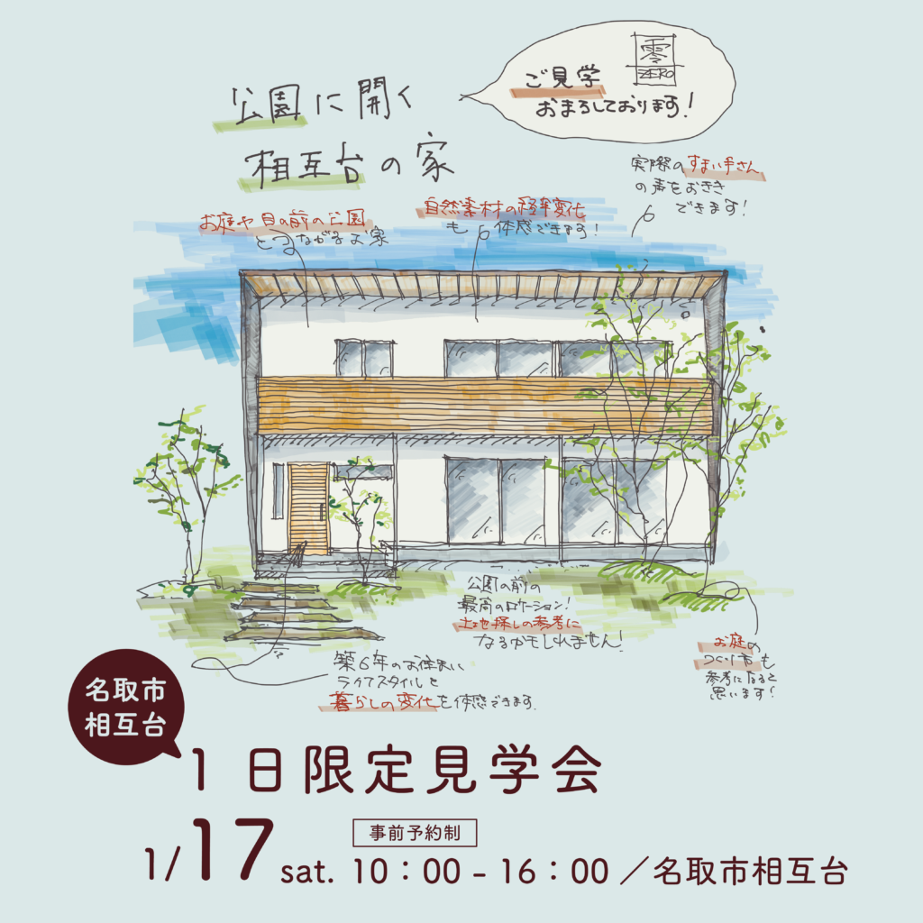 「公園に開く相互台の家」見学会 1.17(sat) 見学会 受付中 #ピックアップ #名取市相互台 #暮らしの見学会 いますぐ予約する 1.17(sat) 1時間 / 回 10:00 - 11:00 - 13:00 - 14:00 - 15:00 - このイベントを予約する 今回見学会を開催させていただくのは、名取市相互台に建つお住まい。 外に対して心地よく視線が抜け、すぐ目の前にある公園のロケーションを借景とし、暮らしに取り入れています。 季節によっては、公園の木々が紅葉に染まっていく様を、特等席のウッドデッキで存分に楽しむことができるお住まいです。 お住まいになられてから年数が経っているため、自然素材の住まいの変化を実際に体感することができます。 また、すまい手さんから実際にお話を聞くこともできます。 自然素材の家を検討している方には、ぜひご覧いただきたい見学会です。この機会に、ぜひお越しください。 すまい手さんのご見学も大歓迎!この機会に、ぜひお越しください。 すまい手さん宅訪問見学会参加者様の声 設計・現場管理・担当大工:建築工房零 ご案内スタッフ:アドバイザー(坂上恭平/児玉元起/宮崎千遥/武田莉佳) イベント詳細 開催日時 01/17(土)10:00、11:00、13:00、14:00、15:00 住所 宮城県名取市相互台 備考 ・開催場所は、ご予約いただいた方へ直接ご連絡いたします。 ・完成見学会同様、託児などの対応はございません。 お子様といらっしゃる場合は、手をつなぐ、抱っこをするなどのご対応をお願いいたします。 ・オンラインでもご案内しております。是非お気軽にご相談ください。 ・零の家づくり検討中の方を優先してご案内いたします。予めご了承ください。 イベント来場予約 ご参加をご希望の際は、下記に必要事項を入力し、「確認画面に進む」ボタンを押してください。 事前にご予約をいただきますと、お客様のご要望に沿った最適な準備ができ、より多くのご提案が可能です。 お急ぎの場合はお手数ですが、お電話でご予約ください。 参加イベント名 「公園に開く相互台の家」見学会 ご希望日 来場希望日を選択してください。 お名前 ふりがな ご住所 郵便番号 都道府県 選択してください北海道青森県岩手県宮城県秋田県山形県福島県茨城県栃木県群馬県埼玉県千葉県東京都神奈川県新潟県富山県石川県福井県山梨県長野県岐阜県静岡県愛知県三重県滋賀県京都府大阪府兵庫県奈良県和歌山県鳥取県島根県岡山県広島県山口県徳島県香川県愛媛県高知県福岡県佐賀県長崎県熊本県大分県宮崎県鹿児島県沖縄県 市区町村番地 建物など 電話番号 メールアドレス 人 数 大人 123456789 11歳以下 0123456789 6歳以下 0123456789 3歳以下 0123456789 ご質問など Japan 当社の個人情報保護方針について、ご同意の上、確認画面へお進みください。 個人情報の取扱いに同意する ご予約は、お電話、予約フォームで承っております。 家づくりの参考になる「リアルな情報」が満載です! 下記のお電話、予約フォームよりお気軽にお申込みください。 tel. 022-725-2261 9:00~17:00(土日祝日も受付) 定休日 : 毎週水日 その他のイベント ZEROBACO・AOBACO 新春プレミアム見学会 in 泉区薬師堂 1.10(sat)-12(mon) 見学会 受付中 #アオバクラフト #ピックアップ #規格型住宅 平屋、はじめました。 ZEROBACO・AOBACO × 平屋相談会 1.17(sat)-25(sun) 相談会 受付中 #アオバクラフト #ピックアップ #規格型住宅 ゼロノワ不動産セミナー ~空き家編~ 1.25(sun) 相談会 受付中 #セミナー #ピックアップ #不動産 #仙台駅前 BACK ALL