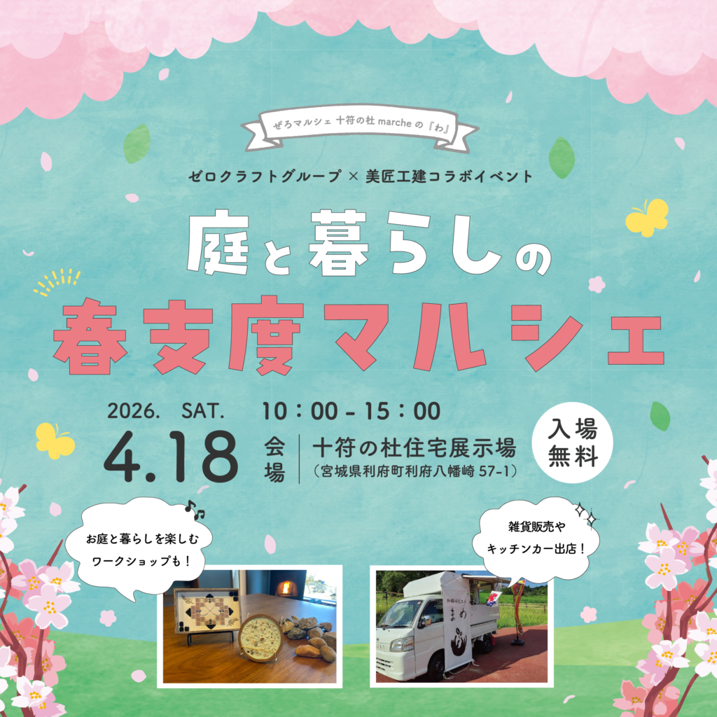 庭と暮らしの春支度マルシェ 〜建築工房零×美匠工建コラボイベント〜 4.18(sat) イベント 受付中 #ぜろマルシェ #ピックアップ #利府町 いますぐ予約する 4.18(sat) 1時間 / 回 10:00 - 11:00 - 13:00 - 14:00 - このイベントを予約する 心地よい春はもうすぐそこ。 自然素材の家づくりを行う「建築工房零」と、庭のある暮らしをご提案する「美匠工建」による、 スペシャルイベントの開催が決まりました! お庭での時間を豊かにするワークショップや、暮らしを彩る素敵な雑貨販売など、春が待ち遠しくなるコンテンツが盛りだくさん🌸✨ 「もっとお庭を活用したい」「暮らしに季節感を取り入れたい」そんな方は、ぜひ遊びに来てくださいね。 当イベントはご予約不要・入場料無料でお越しいただけます♪ ※一部ブースは参加の際予約必須 最新情報は随時更新していきますので、チェックをお忘れなく! ぜろマルシェ 公式instagram ――ワークショップ―― 建築工房零 端材で!ガーデンピックづくり 【捨てちゃうはずの木材を、お庭の主役に♪】 住まいの建築やDIYでどうしても出てしまう、「端材」。 そんな小さな木片たちをアップサイクルして、プランターや花壇を彩るかわいい「ガーデンピック」を作りませんか? 形や大きさがバラバラな端材から、ピンときたものを選んで、色を塗ったり模様を描いたり。 初心者の方やお子様も、パズルのような感覚で楽しくご参加いただけます! ※画像はイメージです ■開催時間:10時~15時 ※各枠30分程度 ■料 金:500円(税込) ※お支払いはpaypayのみとなります。現金でのお支払いは原則不可となりますので、予めご了承ください。 ■事前予約:不要 ※混雑時にお待ちいただく場合がございます。予めご了承ください。 ■定 員:20組 建築工房零 instagram 美匠工建 洗い出しコースターづくり 【左官の伝統技法「洗い出し」を体験!】 玄関の土間やアプローチで見かける、小石が浮き出た美しい床。 あの「洗い出し(あらいだし)」という技法を、自分のお家で使えるコースターで体験してみませんか? 洗い出しは、日本で古くから愛されてきた左官(さかん)の伝統技法。 セメントに砂利や天然石を混ぜて塗り込み、完全に固まる前に表面を水で丁寧に「洗い流す」ことで、中の石の表情を浮かび上がらせます。 自分で石を選び、自分の手で洗い出したコースターは、特別な一品になるはず。ぜひご参加お待ちしております! ■開催時間:10時~15時 ※各枠30分程度 ■料 金:500円(税込) ■事前予約:不要 ※混雑時にお待ちいただく場合がございます。予めご了承ください。 ■定 員:50組 美匠工建 instagram mimimi.garden 建築工房零すまい手歴18年、 「グリーンアドバイザー」のmimimi.gardenです 今回は、お庭や玄関先を彩る「春の寄せ植え」を作りませんか? 色とりどりの花だけでなく、表情豊かなカラーリーフを使います。可愛らしさ+シックな寄せ植えを。お気に入りの鉢をご持参いただいてもOK。 当日は、厳選した苗木や宿根草の販売も行います。緑のある暮らし、一緒に楽しみましょう ■開催時間:①10時~ ②11時~ ③13時~ ④14時~ ※各枠40分程度 ■料 金: ワークショップ参加費(プランター付き):2,000円(税込) ※持ち込み鉢にも植え込みができます。大きさにより料金が変わります。 ご希望の方は、事前にmimimi.gardenのinstagramのDMにてお知らせください。 ■定 員:8組(各枠2組ずつ) ■事前予約:事前予約制 【お申し込み方法】 本サイトの予約フォームよりお申し込みください。 ※備考(質問)欄に必ず「寄せ植え参加希望」とご記入をお願いします。 ■ 鉢を持ち込みされる方へ 予約フォームへの入力に加えて、事前にmimimi.gardenまでインスタDMにてお知らせください。(鉢の大きさにより料金が変動するため、詳細を確認させていただきます) mimimi.garden instagram ――雑貨販売―― 月夜の雑貨店 低温で焼成が可能な特殊陶土(粘土)で、童話の世界をコンセプトに手の平サイズの置物を制作しております。 ぜひお手に取って見ていただけたら嬉しいです。 月夜の雑貨店 instagram Rim's flower 20年以上の店舗勤務を経て、2025年11月末、宮城野区清水沼公園近くに「Rim’s flower」花屋をOPENしました。 これまでの知識や経験を活かし、地域の皆様やこれまでのお客様との会話を大切にお客様の気持ちに寄り添った花屋を目指しております。どうぞ1本でもお手に取り、お気軽にお越しください。 Rim's flower instagram 珈琲バルSTRAY CAT 自家焙煎のコーヒーをメインに宮城県全域で出店しているキッチンカーです。 近々、『おみくじクレープガチャ』を始める予定です。 乞うご期待!! 珈琲バルSTRAY CAT instagram ――暮らしに役立つ無料相談会―― 建築工房零による住まいのご相談 美匠工建によるお庭のご相談 ほけん相談室ウィルによる保険のご相談 経験豊富なプランナーが、具体的なアドバイスを行います。 無料でご相談可能です!気になる方は、ぜひお気軽にご相談ください♪ 駐車場はこちら ※駐車台数には限りがあります(20台程度)。予めご了承ください。 【