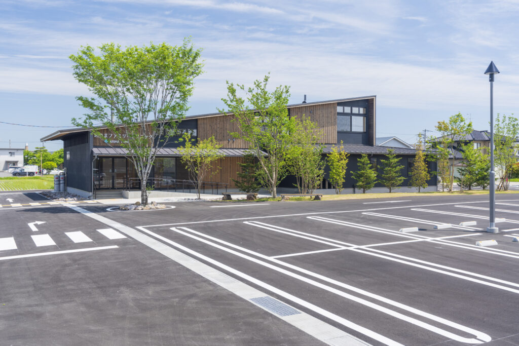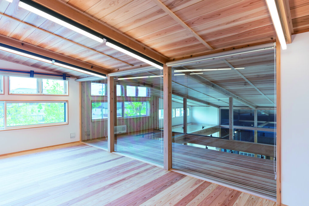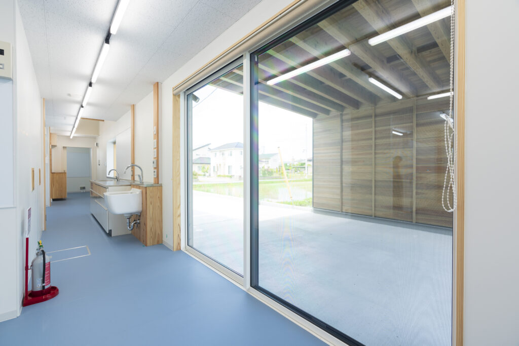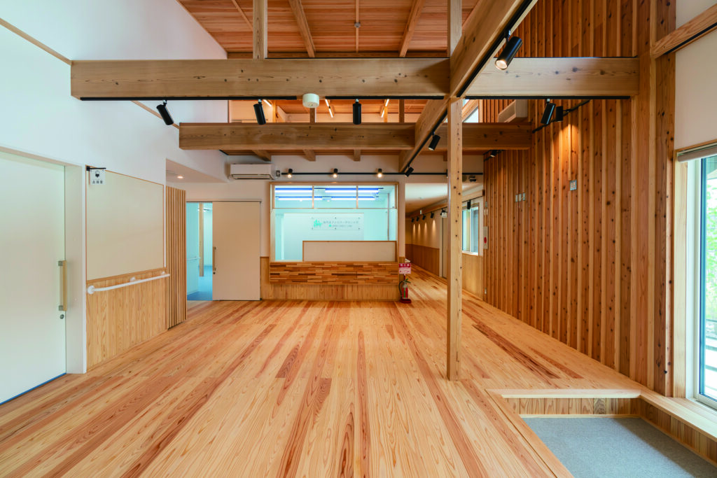 施設建築 施設建築 木造でつくる、地域にひらかれた病院建築 ― 医療と子育てを、木の温もりで包み込む ― RC造が主流とされてきた病院建築において、本施設は木造軸組工法を採用し、国産無垢木材を積極的に用いた医療空間として計画されました。 無垢材と自然素材がもたらすやわらかな空気感は、子どもや保護者の不安を和らげ、訪れる人に安心感を与えます。 プロジェクト概要 施設用途:病院(小児・病児保育併設) 構造・工法:木造軸組工法 主な使用材:国産無垢杉材(構造・床) 規模:延べ床面積 約390㎡/2階建 設計・施工:建築工房零による一貫体制(社員大工による施工・現場管理) なぜ、木造を選んだのか 病院建築では、防耐火性や設備計画の合理性から、RC造が選ばれることが一般的です。 本施設ではその前提を踏まえたうえで、建物規模や運営形態、地域との関係性を丁寧に整理し、木造であることが最も合理的であるという結論に至りました。 無垢木材と漆喰に包まれた空間は、医療施設に求められる清潔性を確保しながらも、冷たさや緊張感を和らげ、特に小児医療や病児保育において、子どもと保護者が落ち着いて過ごせる環境を生み出しています。 構造から空間まで、木を使い切る 本施設では、床材だけでなく構造材にも国産無垢杉材を使用しています。 木材はすべて近郊地域から調達し、適切な手入れや間伐を前提としたスギ材を活用することで、森林循環に寄与するカーボンニュートラルな建築を実現しました。 また、壁には漆喰を採用し、無垢木材との組み合わせによって、自然素材ならではの調湿性や肌触り、視覚的な温かさを建物全体で体感できる空間としています。 設計と施工がつながることで生まれる建築 本施設の設計・施工は、地域工務店による自社一貫体制で行いました。 施工および現場管理を担ったのは、自社の社員大工。設計意図を現場で正確に汲み取り、細部まで落とし込むことで、精度の高い施工を実現しています。 また、電気配線を壁内に埋め込まない仕様とすることで、将来的な修繕や改修にも柔軟に対応可能としました。 これは「建てたあとも直しながら使い続ける」ことを前提とした、長寿命な病院建築のための工夫です。 写真で見る空間構成 片流れの大屋根と、黒と木部を組み合わせた外観が印象的な建物。 軒のかかったポーチと山採りの植栽が、街並みにやさしく溶け込みます。 外壁と同様の木板張りを施した待合室。 社員大工による造作カウンターと無垢杉の肌触りが、訪れる人を迎え入れます。 大屋根の形状を活かし、玄関から待合室へと視界が広がる構成。 2階カンファレンスルームは、防音性を確保しつつ、吹抜けを通して階下とのつながりを感じられる空間としています。 社員大工による造作カウンター 医療と子育てを支える地域の拠点として 隔離診察室やドライブスルー受付を備え、病児・病後児を受け入れる「しまうま保育室」を併設。 医師・看護師・保育士が連携し、子ども一人ひとりの状態に寄り添ったケアを行います。 この建物は、特別な材料や工法に頼るのではなく、地域の大工がつくり、地域の人が使い続け、手を入れながら育てていく病院です。 医療と子育てを支える場として、これからも地域に根付き、永く使い続けられる建築であることを目指しています。 BACK