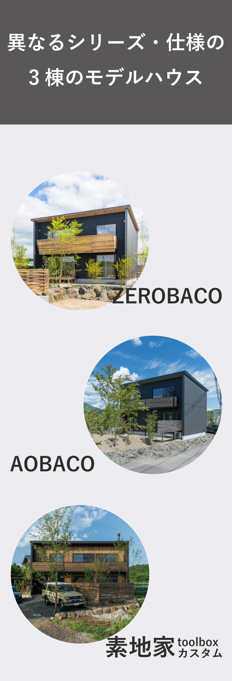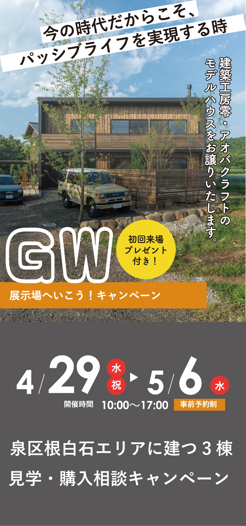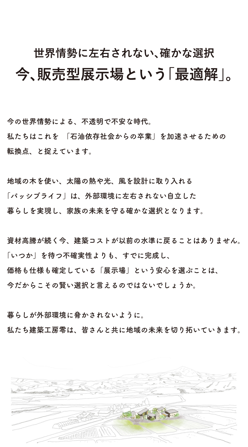 4.29 (wed) - 5.6 (wed) ゴールデンウィーク『ゼロバコ・アオバコ・素地家』3棟ご案内 見学予約をする 見どころ POINT 忙しい毎日にゆとりを ーふとした瞬間に感じる豊かさー キッチンからリビング空間を望むと、大きな窓がシームレスに庭や空を切り取ります。 前面道路を走る車からは見られず、室内からは開放的な眺望を。 大胆に窓を取っても落ち着くのは、外からは見られない安心があるから。帰ってきたら、まず窓の前でゴロン。としたくなる、そんな空間です。 (写真はZEROBACO) POINT 流行に左右されないスタンダードなデザイン ーつくり手が選定した上質なデザインー 仕様が異なる3棟ですが、共通するのは、気を衒わないスタンダードな良さを感じられるデザインであること。ZEEOBACOは杉の無垢材、AOBACOは突板、素地家は合板表しの床。それぞれ、アイアンの鉄骨階段や、アクセントカラーでその住まいのキャラクターを引き立てています。 この3棟は販売型のモデルハウス。造作家具や薪ストーブなどはそのままでお引き渡しが可能なため、実際の暮らし心地を想像しながらご確認いただけます。 (写真はAOBACO) POINT パッシブライフがもたらす実際の「心地よさ」 ー本当に豊かな住まいを提供するためにー 私たちが届けたいのは数値上の「高性能」ではなく、肌身で感じる、一生の快適さです。そのため、熱の逃げにくさを表す断熱スペック(Ua値)ではなく、「窓からの日射取得」を暖かさの指標として重視し、数値では表しきれないものの、「本当にあたたかい」住まいづくりを続けています。言葉では語れないこの快適性を、ぜひ現地でご体感ください。 (写真は素地家toolboxカスタム) 見学予約をする 3棟に共通する心地よさ この3棟が建つ泉区根白石・朴沢エリアってどんな場所? すでに建っているモデルハウスに住まうメリット すでに建っているモデルハウスと、これから同条件で注文住宅で建築する場合、 ▽ZEROBACO 土地・外構込み:3,950万円(当時の工事価格でのご提供) 【お支払い例】 借入金額:3,950万円 金利:1.050% 借入期間:40年 → 月々:約100,000円前後 一方で、現在の建築価格水準で同等の住宅を建てた場合、 借入金額:約5,200万円 金利:1.050% 借入期間:40年 → 月々:約132,000円前後 となり、 毎月約3万円以上の差が生じる試算となります。 いずれも、「すぐに住める安心感」と「価格メリット」の両面で、非常に魅力的な選択肢です。 今の時代だからこそ、パッシブライフを実現する時。 4.29 (wed) - 5.6 (wed) ゴールデンウィーク『ゼロバコ・アオバコ・素地家』3棟ご案内 詳細 開催日程 4.29 (水) 〜 5.6 (水) 開催時間 10:00〜17:00 開催場所 宮城県仙台市泉区根白石薬師堂道西1-1 備考 ・建築工房零/アオバクラフトへ初来場の方は、その旨お申し出ください。会場で特典をお渡しいたします。 ・期間中、3会場に常にスタッフが常駐しているわけではありません。事前にご予約が必須となります。 ・ご希望に応じて、3棟全てご案内いたします。ご予約いただきましたら、メール等で調整のご連絡をさせていただきますので、やり取り可能なアドレスや電話番号をご入力ください。 ・見学希望当日や、前日夜のご予約・飛び込みではご案内できない場合がございます。 ・ご希望の2日前を目処に、ご予約くださいますと幸いです。 素地家toolboxカスタム住所:仙台市泉区朴沢鳥居原14−5 イベント予約 下記に必要事項を入力し、「確認画面に進む」ボタンを押してください。 事前にご予約をいただきますと、お客様のご要望に沿った最適な準備ができ、より多くのご提案が可能です。 お急ぎの場合はお手数ですが、お電話でご予約ください。 第1希望日 来場時間を選択 第2希望日 来場時間を選択 お客様の情報 参加イベント名 ゴールデンウィーク『ゼロバコ・アオバコ・素地家』3棟ご案内 お名前 ふりがな ご住所 郵便番号 都道府県 選択してください北海道青森県岩手県宮城県秋田県山形県福島県茨城県栃木県群馬県埼玉県千葉県東京都神奈川県新潟県富山県石川県福井県山梨県長野県岐阜県静岡県愛知県三重県滋賀県京都府大阪府兵庫県奈良県和歌山県鳥取県島根県岡山県広島県山口県徳島県香川県愛媛県高知県福岡県佐賀県長崎県熊本県大分県宮崎県鹿児島県沖縄県 市区町村番地 建物など 電話番号 メールアドレス 人 数 大人 123456789 11歳以下 0123456789 6歳以下 0123456789 3歳以下 0123456789 その他ご質問など Japan 個人情報の保護に関する基本方針 株式会社 建築工房 零(以下、当社といいます。) は、お客様の個人情報の適切な取扱い及び保護が当社にとって社会的責務であると考えております。 当社は、当社が取得する個人情報を、この個人情報の保護に関する基本方針(以下、「本基本方針」といいます。) に基づき、適切に取扱い、保護に努めます。 1. 当社の名称・住所・代表者の氏名 株式会社 建築工房 零 〒981-3213 宮城県仙台市泉区南中山4-3-16 代表取締役社長 小野 幸助 2. 個人情報の取得 当社は、お客様ご本人の個人情報について、利用目