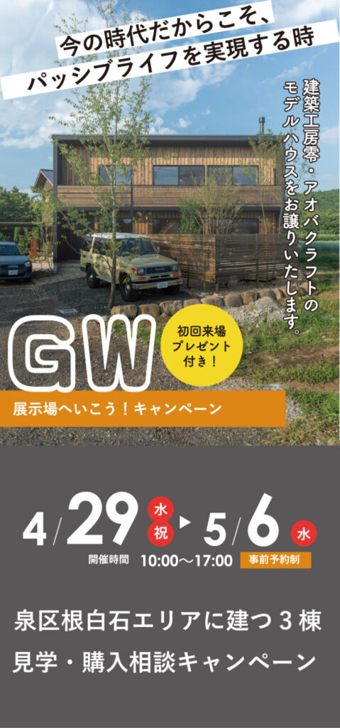 GW休業とモデルハウスご案内のお知らせ(2026.5.2~5.6) 2026.04.27NEW 建築工房零は、下記の日程でお休みをいただきます。 〈建築工房零南中山本社事務所・ストーブショールーム・青森設計室・十符の杜住宅展示場利府モデルハウス〉 【2026年5月2日(土)~ 2026年5月6日(水・祝)】 期間中は、ゴールデンウィーク『ゼロバコ・アオバコ・素地家』3棟住宅見学会を開催しております。 まだお越しになったことがない方は、ぜひこの機会にご来場くださいませ。 ご予約はお問合せフォーム、またはイベントページからお願い致します。 イベント詳細・ご予約はこちら ※期間中のお問合せ、資料請求等につきましては、休み明けに順次対応させて頂きます。 ※上記、GW期間中の水廻りの不具合、電気機器の不具合、サッシ開閉の不具合、雨漏りなどお困りの際は、電話対応・緊急出動対応を行う「住まいるサポート24」サービスにお電話ください。 (お問合せ先は以下のリンクからご覧ください。または「零の住み育冊子」、マグネットからもご覧いただけます。) メンテナンスページはこちら BACK